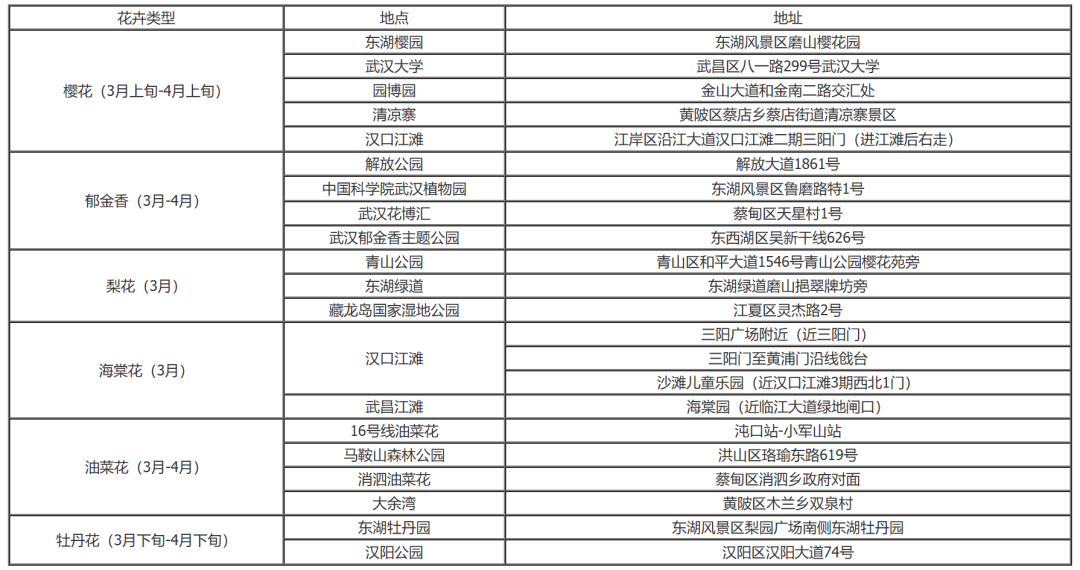 天气逐步转暖,随着梅花、郁金香、樱花等多种花卉逐步进入盛花期,武汉市多处热门点位陆续进入赏花期,其中解放公园、武汉植物园、东湖梅园、晴川阁、堤角公园、沙湖公园、中山公园、新城区的花博汇、郁金香主题公园等公园和景区因花卉种类多或花期时间长,预计吸引较多市民前往,周末期间赏花区域周边可能会出现车辆违停致堵现象。
