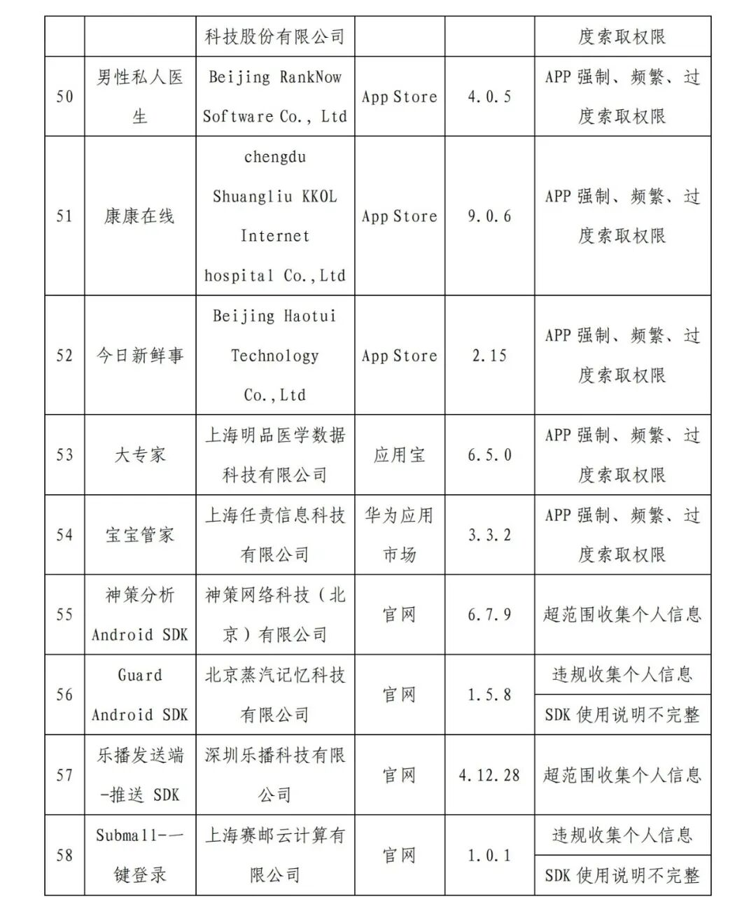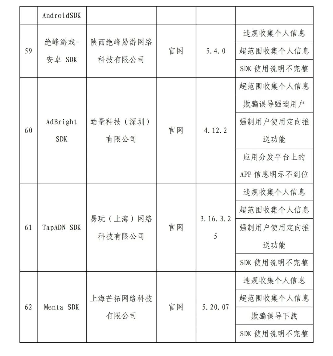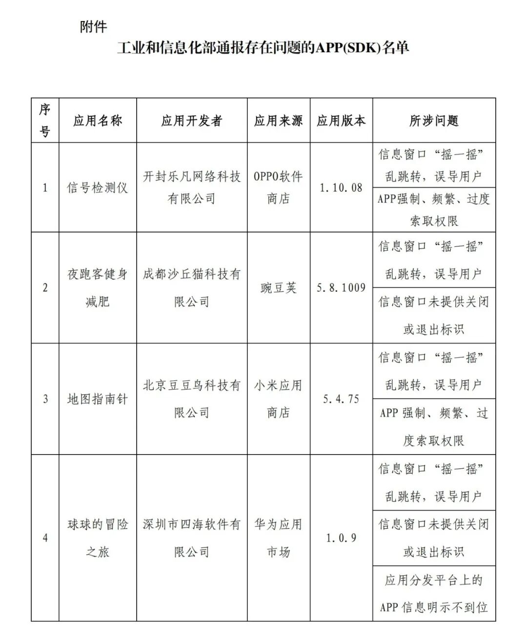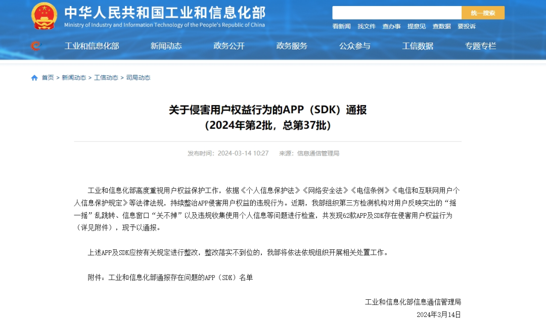 近期,工信部组织第三方检测机构对用户反映突出的“摇一摇”乱跳转、信息窗口“关不掉”以及违规收集使用个人信息等问题进行检查,共发现茶百道、怪兽充电等62款App及SDK存在侵害用户权益行为。上述App及SDK应按有关规定进行整改,整改落实不到位的,工信部将依法依规组织开展相关处置工作。