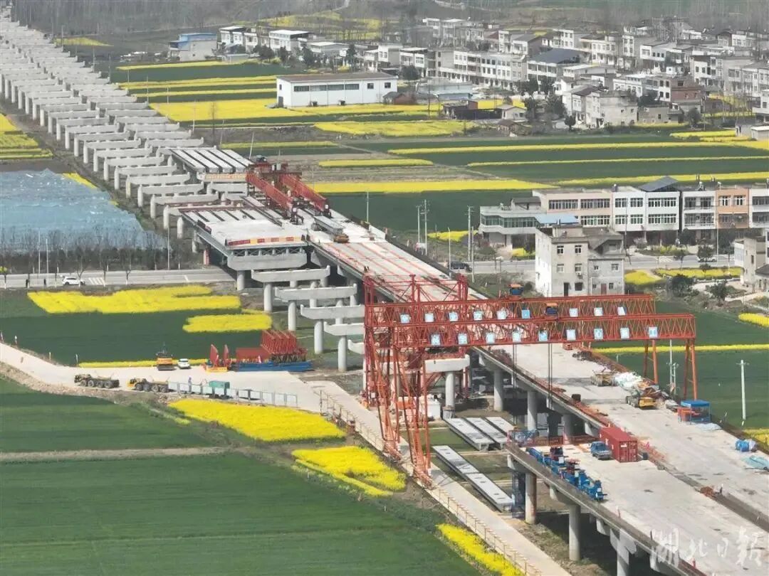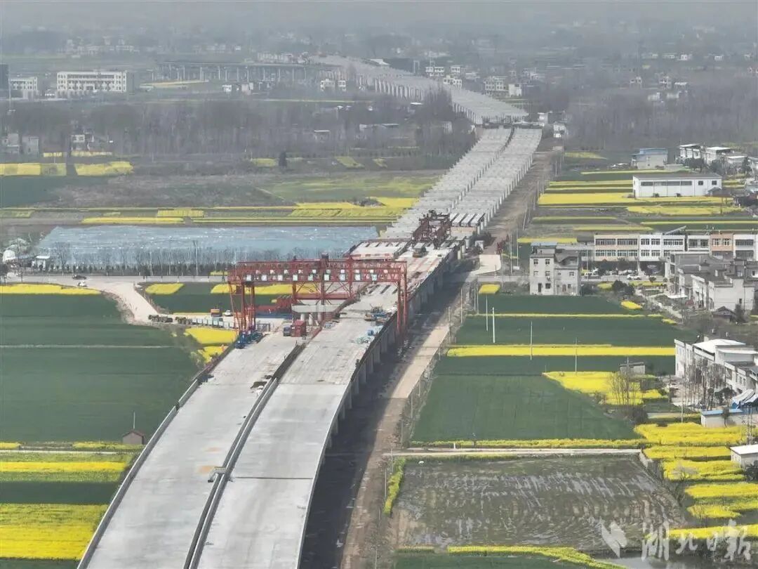 近日,记者在施工现场看到,天门岳口镇徐越村的武(汉)天(门)高速工地塔吊林立,机器轰鸣,工人们正在架设桥梁,蝴蝶型八向互通已轮廓初现。这里横跨随岳高速,建成后为湖北省少有的双向六车道高速公路。