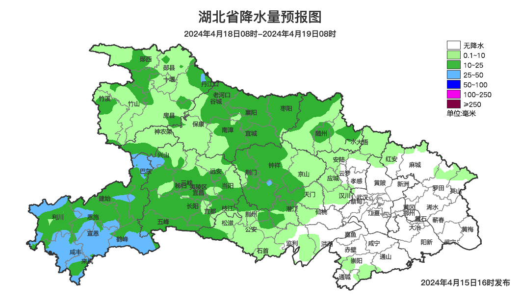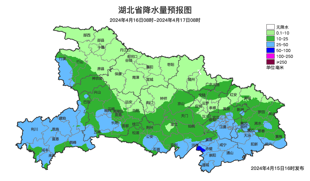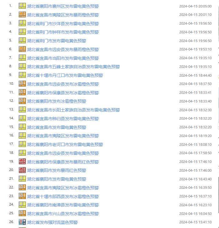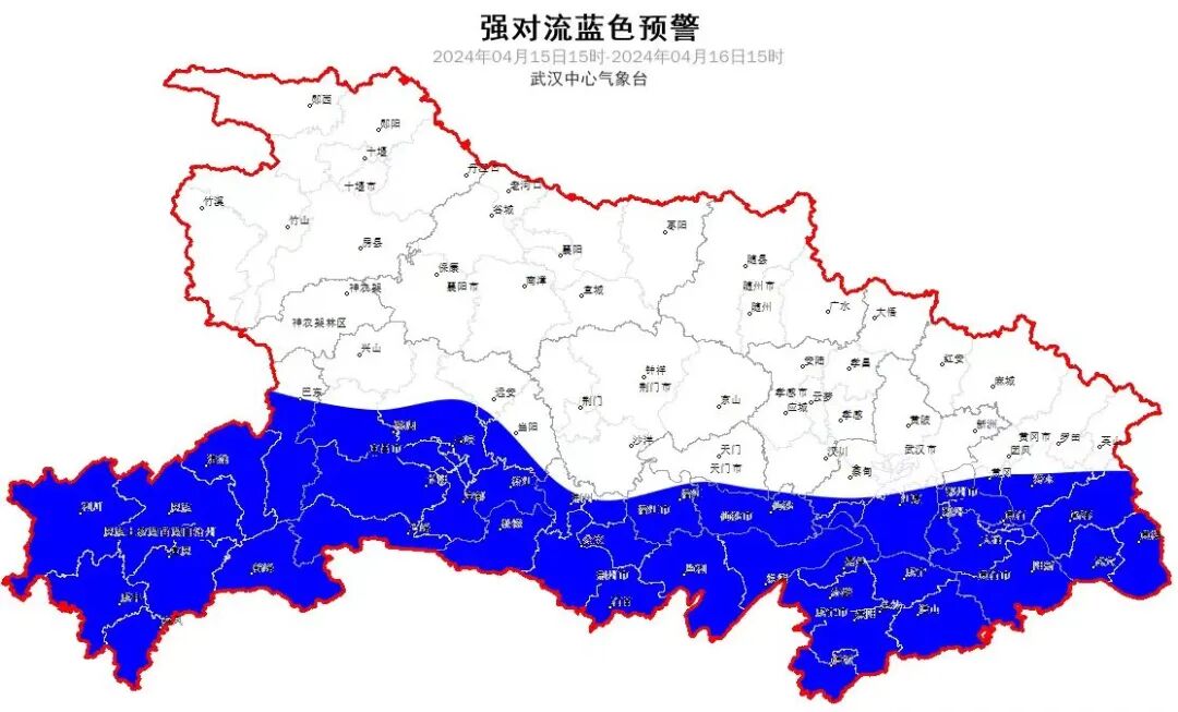 预计4月15日20时至16日20时,恩施、宜昌、荆州、 潜江、天门、仙桃、武汉南部、黄冈南部、鄂州、黄石、咸宁 等地将有雷电天气,部分地区有短时强降水,最大小时雨强20至50毫米,局地有8至11级雷暴大风或冰雹天气,请注意防范。