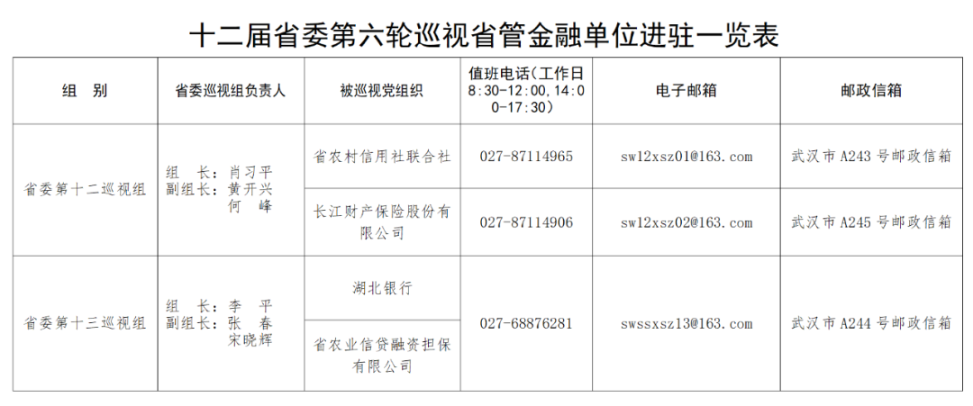 根据省委统一部署,本轮巡视将对省农村信用社联合社、湖北银行、长江财产保险股份有限公司和省农业信贷融资担保有限公司等4家省管金融企业党委开展常规巡视,同步开展选人用人工作专项检查。工作时间2个月左右,巡视期间设立专门值班电话、邮政信箱、电子邮箱和“荆楚码上巡”信访反映二维码,主要受理反映被巡视党组织领导班子及其成员、下一级主要负责人和重要岗位人员问题的来信、来电,重点是关于违反政治纪律、组织纪律、廉洁纪律、群众纪律、工作纪律和生活纪律以及巡视整改等方面的问题反映。巡视组受理信访时间截止到2024年6月15日。