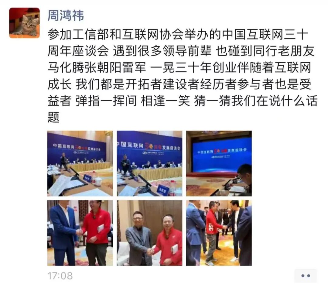 刚刚过去的周末,360创始人周鸿祎发朋友圈称,自己参加中国互联网三十周年座谈会,遇到很多领导前辈,也碰到同行老朋友,“一晃三十年创业,伴随着互联网成长,我们都是开拓者、建设者、经历者、参与者也是受益者。”