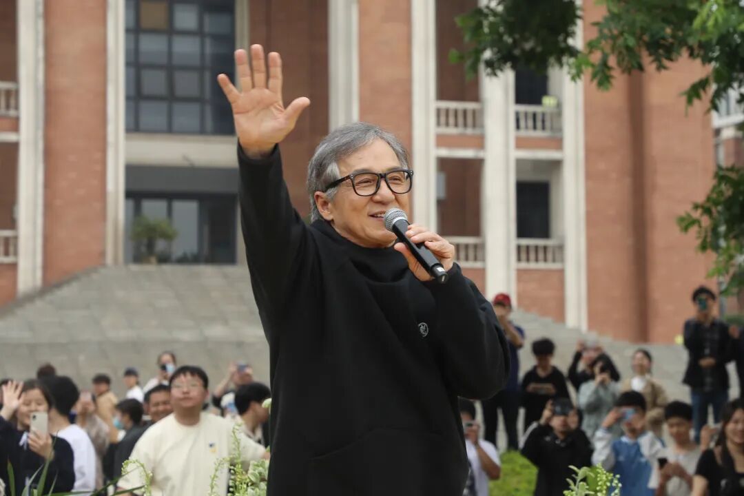 同学们高喊“院长好”,成龙回应同学们关切时表示:“每天早上花1个多小时把头发刷白。是老,但不是你们想象中的老,放心放心,我还很健壮。”