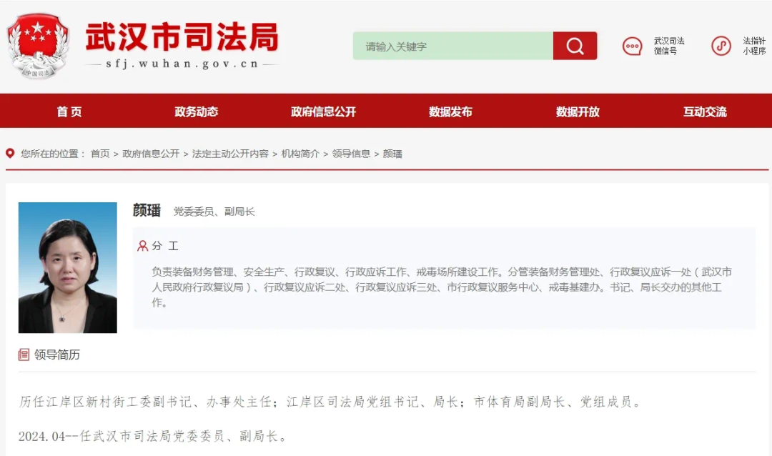 公开资料显示,颜璠历任江岸区新村街工委副书记、办事处主任;江岸区司法局党组书记、局长;武汉市体育局副局长、党组成员。