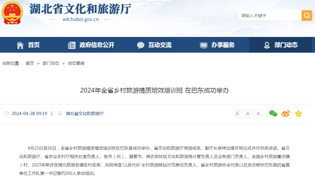 据“湖北文化和旅游厅”官网报道,4月23日至26日,全省乡村旅游提质增效培训班在巴东县成功举办,省文化和旅游厅党组成员、副厅长吴烨出席开班仪式并作动员讲话。