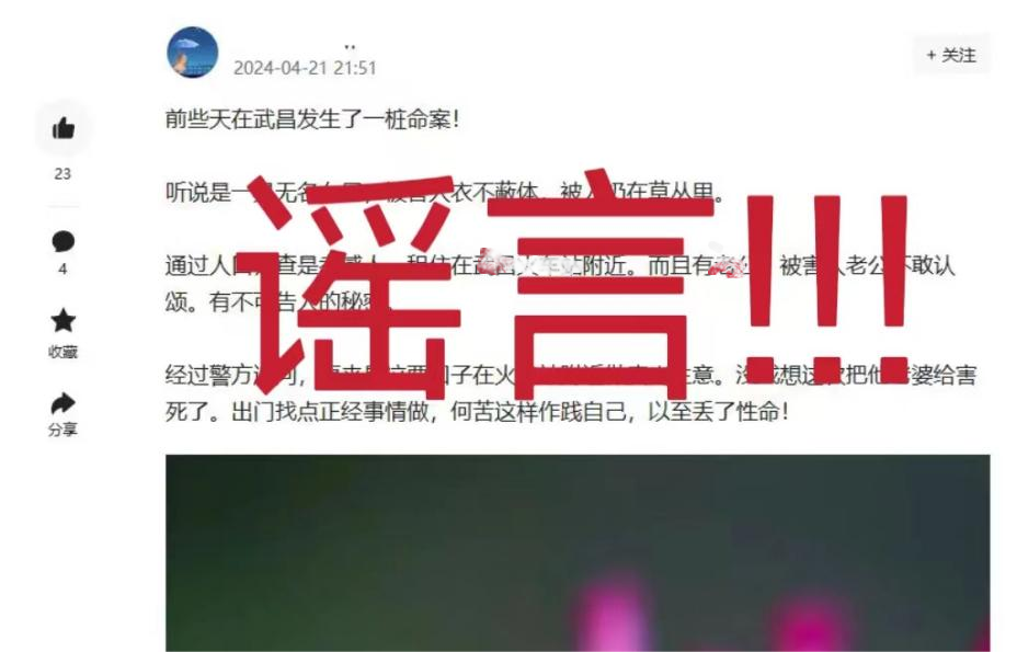 4月21日,樊某在网上发布贴文称“前些天在武昌发生了一桩命案!听说是一具无名女尸,被害人衣不蔽体,被扔在草丛里。”经核实,该网民为吸引流量,增长粉丝,故意编造了此虚假信息进行发布,造成了严重社会舆论影响。经查,樊某承认了其违法事实。目前,武汉公安机关已依法对违法行为人樊某予以行政处罚。