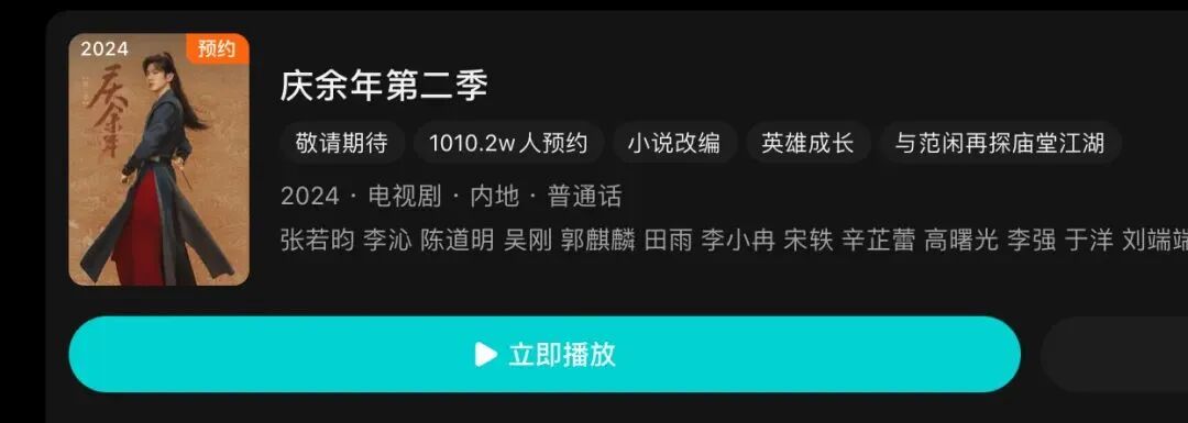 《庆余年第二季》将于5月16日起,在CCTV-8黄金强档每日19:30播出,腾讯视频全网独播。5月9日,该剧在腾讯视频站内预约已破1500万。