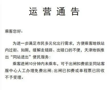 据天津市交通运输委员会5月14日消息,为方便乘客在地铁站过街、使用卫生间,缓解走错路、出错口的不便,天津地铁推出“同站进出”服务。