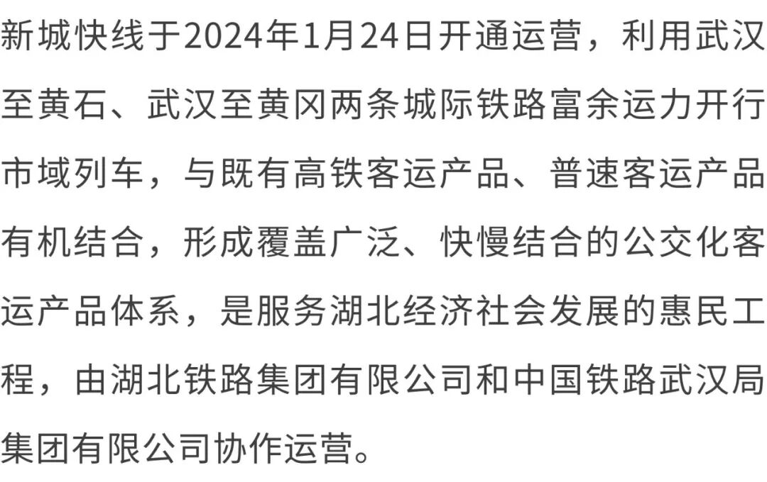 新城快线设有武汉东站、大冶北站、黄石北站、黄冈西站、鄂州站等站点。其中,武汉东站是首发站,单日办理新城快线列车最高可达50列。