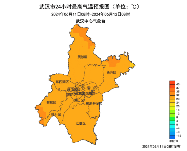 预计12日白天,十堰、襄阳、宜昌、恩施低山地区、荆门、孝感最高气温将升至35℃以上,其中十堰、襄阳局地可达37~39℃,请注意防范。