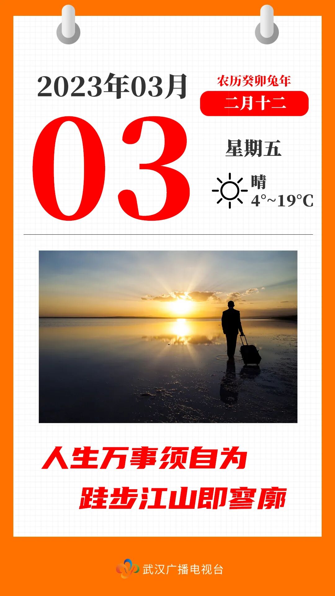 进入3月,湖北省大部地区阳光“上线”。预计3日和4日两天,全省天气晴好,气温上升,最高气温大都升至20℃以上,部分地区可达24℃,不过早晚最低气温几乎都在10℃以下,部分地区仅4℃至5℃,提醒公众早晚外出多穿一件。详情>>>