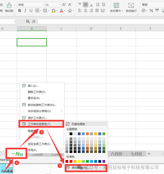 在我们平时使用Excel表格时,经常会碰到在一个工作表中加入多个工作簿,为了让工作簿看起来更有序,且查看起来更加方便,我们往往需要对不同的工作簿标签添加颜色,那么这是如何设置的呢?下面我们就来学习一下。首先我们打开一个工作表,右键点击下方的工作簿标签,在弹出的菜单中选择【工作表标签颜色】,在弹出的二级菜单中选择【其他颜色】: