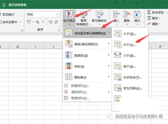 2.之后点击条件格式,然后选择突出显示单元格规则,可以看到有很多条件格式,此处我们选择小于;