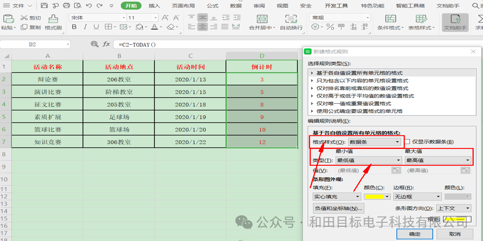 在【新建格式规则】中把【格式样式】改为【数据条】,【类型】改为【最低值】和【最高值】,再点击【确定】 如图所示;