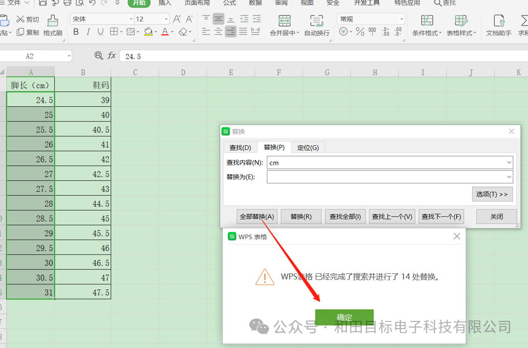 然后鼠标选中所有想要去掉单位的数据单元格区域A2:A15,再点击“全部替换”,就可以在工作表中发现,A列中的数字后面的单位全部被删掉了,并会弹出一个查找替换的统计结果,有14处完成替换,如下图所示: