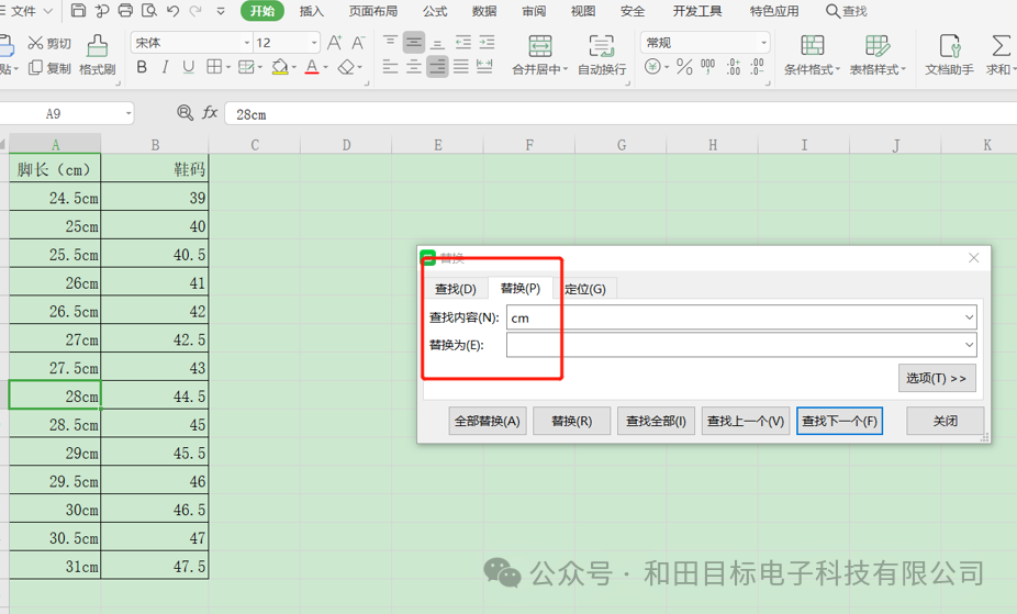 在查找界面,点“替换”选项,并在“查找内容”处输入“cm”,然后”替换为”那栏放空白,表示不要“cm”,具体操作如下图所示: