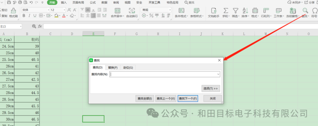 首先在工作表的界面中,按下查找的快捷组合键“ctrl+F”,或者在菜单栏中点击“查找”按钮,这时会弹出查找的对话框,如下图所示: