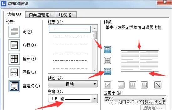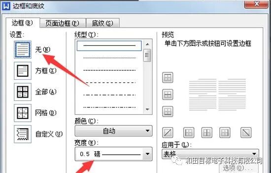 4、在边框与底纹中,先将表格所有的边框都设置为“无”,然后选择一个合适的线条磅数,如图所示;