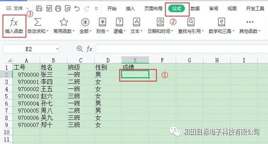 2.此时我们可以使用vlookup函数,第一步,先打开学生表,然后选中E2单元格,在菜单栏依次选择“公式”--->“插入函数”;
