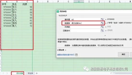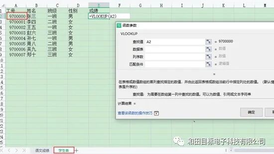 4.如图,弹出vlookup选择页面,“查找值”填写"A2",即根据学生表学号进行查找成绩表数据;