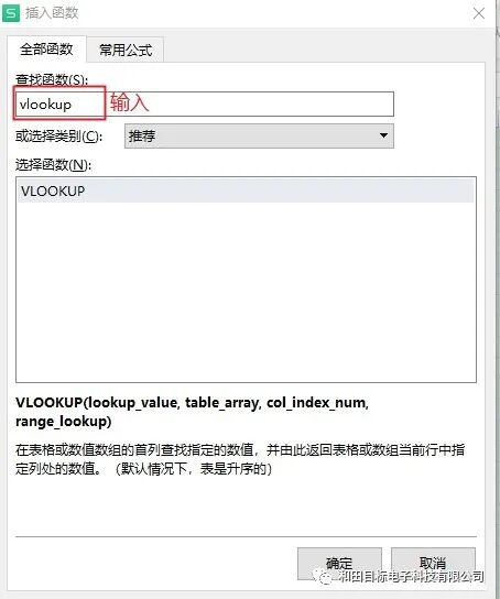 3.然后弹出窗口如下,输入要使用的‘vlookup’函数名,点确定;