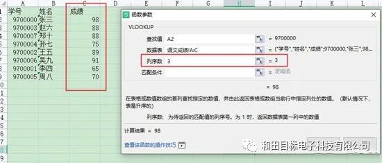 6.“序列数”填写3,要查找的成绩,在第三列数;