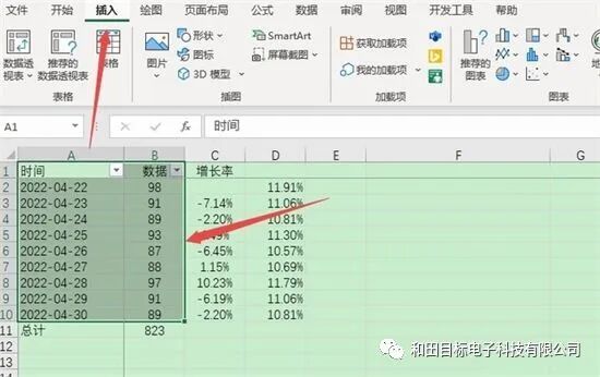 1.Excel表格中,选择要制作折线图的数据列,点击“插入”;