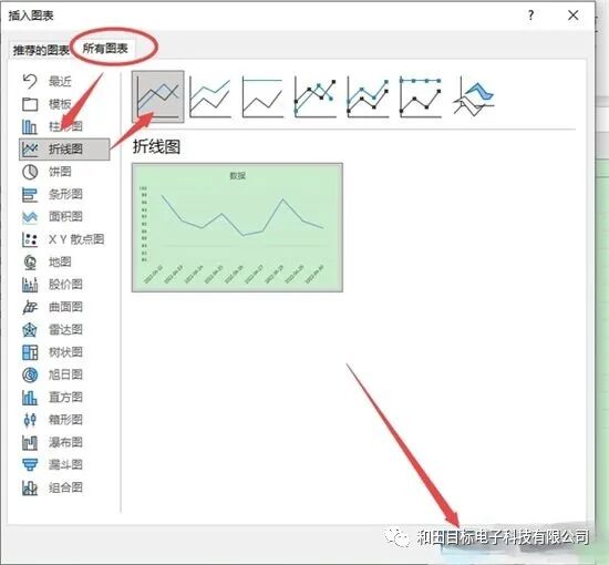 4.在所有图表中,点击“折线图”,然后点击第一个折线图样式,点击确定;