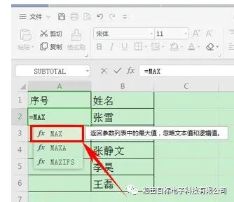1、在序号里输入“=MAX”,然后选择MAX函数;