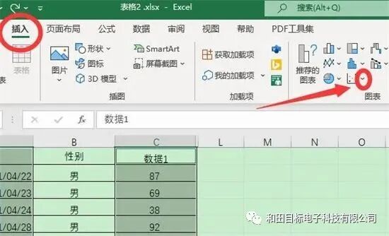 2.点击菜单栏中的“插入”,然后点击图表中散点图右侧的下拉三角标;