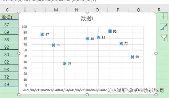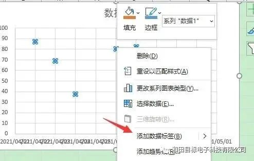 4.就可以生成散点图了,右击散点图中数据点的位置,点击“添加数据标签”,可以使得每个点出现对应的数据。