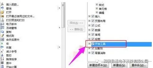 2.左侧选择自定义功能区,然后在右侧的第二个列表选择框选择开发工具,确定;