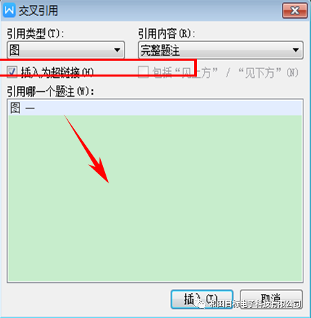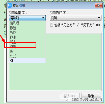 另外我们还需要在文中引用题注“如图一所示”这个图一我们不能手打,需要点击【交叉引用】,弹出对话框。如图 四所示