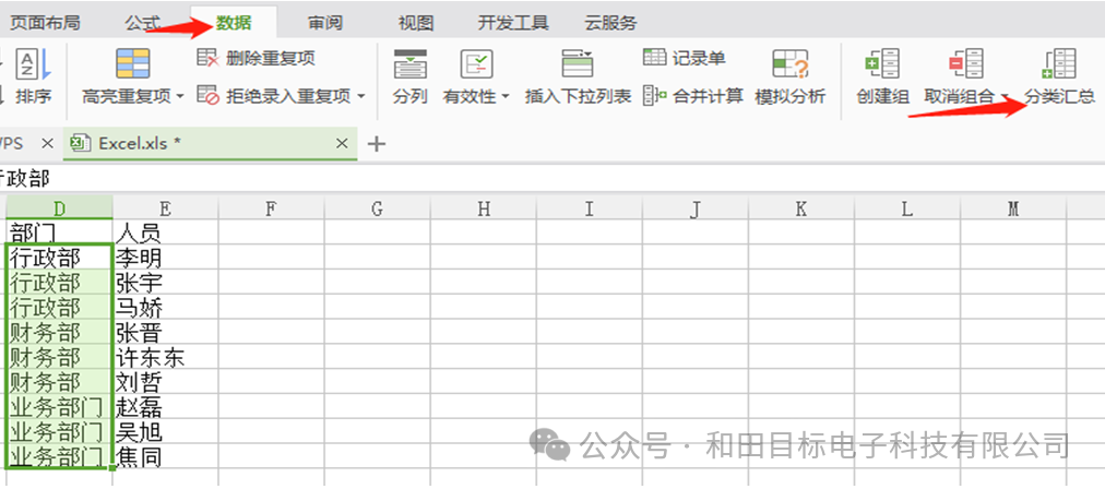 我们把几个部门选中,点击工具栏【数据】,再点击【分类汇总】,操作如下图: