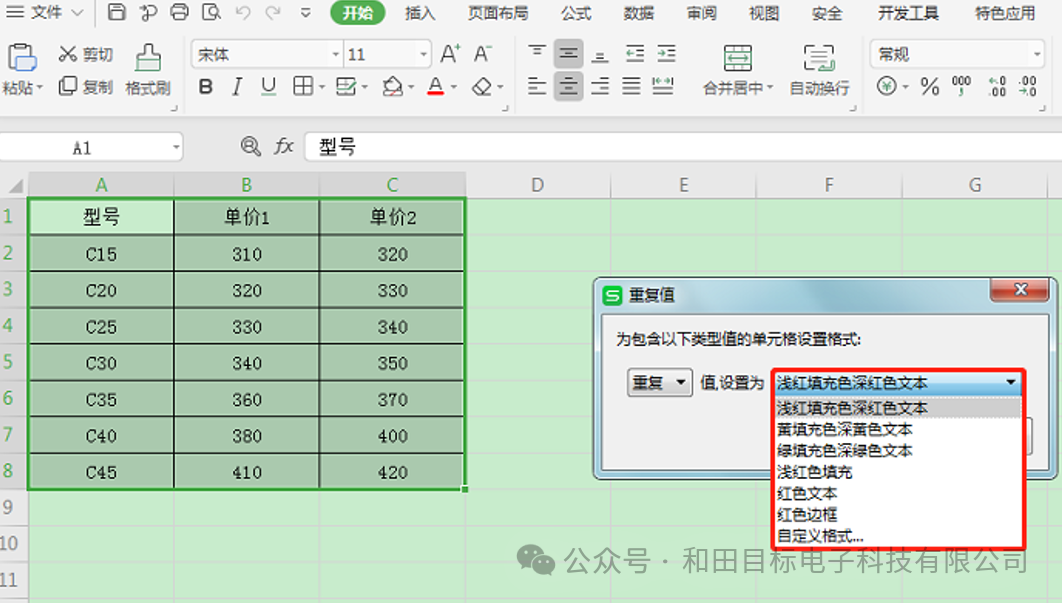 弹出重复值对话框,选择“重复值”设置突出显示的颜色即可,默认的选择是重复值设置为浅红填充色深红色文本,下拉也有其他的格式可以选择,当然也可以自定义格式来标识重复项的颜色: