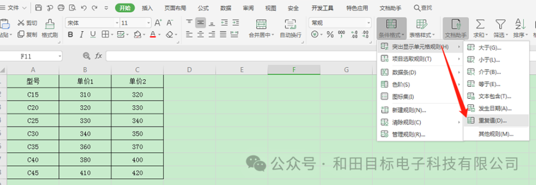 在“条件格式”下拉项“突出显示单元格式规则”中的“重复值”: