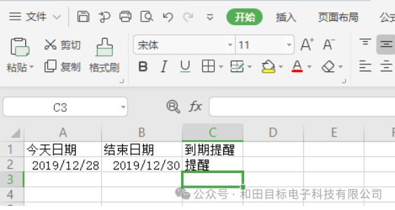 在C2单元格输入公式=IF(B2-A2<=10,"提醒",""),当今天日期在距离结束日期0天内,到期提醒就会显示提醒: