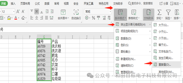 然后再在列表中点击【条件格式】,之后在弹出的列表中点击【突出显示单元格规则】,再选择【重复值】,如下图所示: