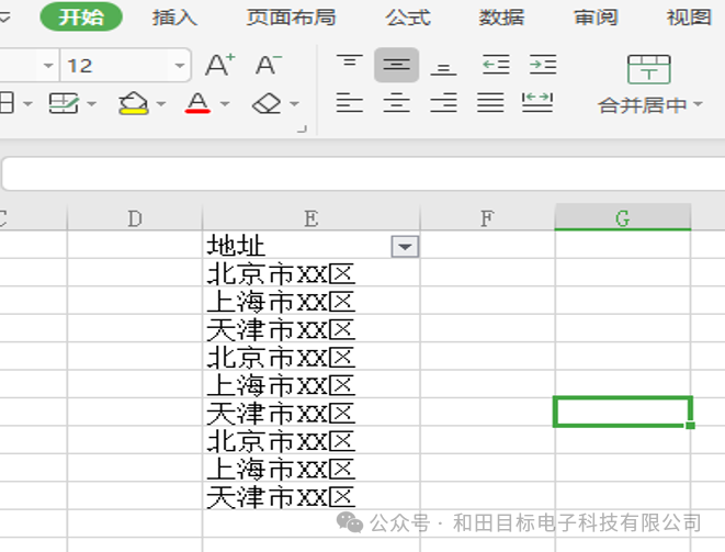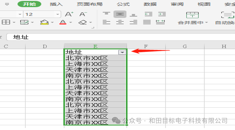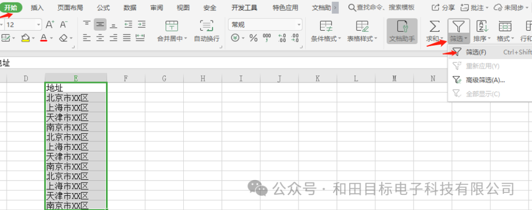 选中这几个地址,鼠标点击工具栏下的【开始】,然后点击【筛选】,再选择下拉菜单中的【筛选】,如下图所示: