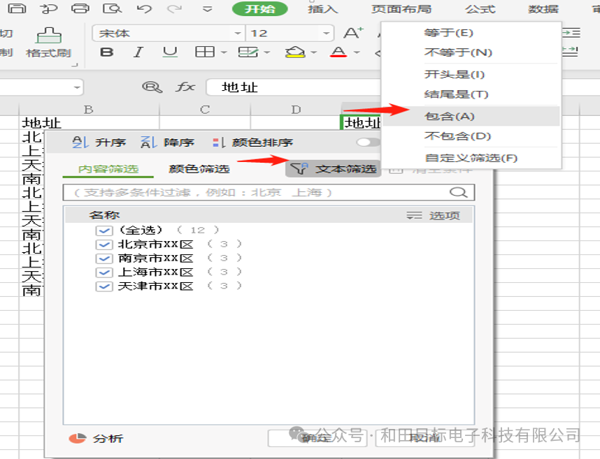 点击按钮后会弹出一个下拉菜单,点击其中“文本筛选”子菜单中的“包含”: