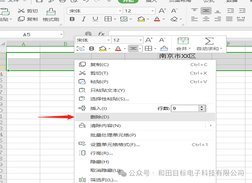 点击确定按钮后,表格中就只显示包含“南京市”字样的行了,其他的行都被隐藏了。 选中这三行,鼠标右击,点击删除: