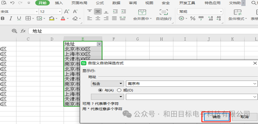 点击后会弹出对话框,在“包含”处右侧的输入框中输入要删除的行中包含的字符,本例为输入“南京市”,然后点击“确定”按钮: