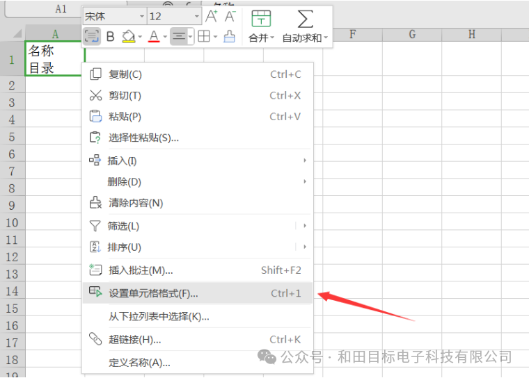 第二步:比如名称和目录在一个表格,然后需要在名称和目录中间加一条斜线。选择单元格,然后单机鼠标的右键,然后再点击【设置单元格格式】: