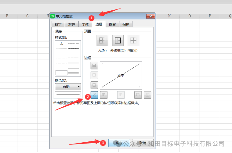 第三步:在边框菜单栏里找到一条斜线的文本模式,然后点击【确定】: