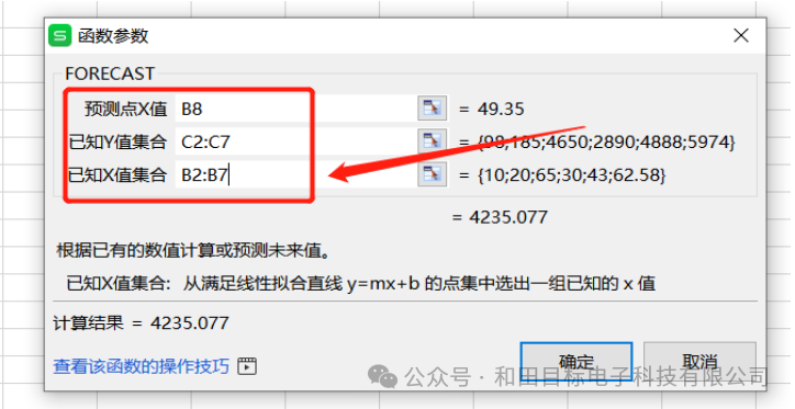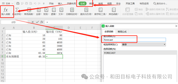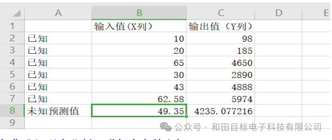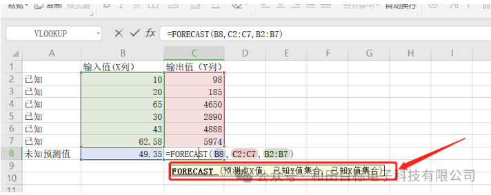 首先我们需要了解一下FORECAST函数,FORECAST函数主要作用就是依据已有的数据,依据线性回归代数,去预测未知的数据。 如下图,第2行至第7行为已知数值,每一个输入列(A)对应一个输出值(B)。我们要根据2-7行的已知数值来预测第8行的数值,FORECAST函数的作用就是第八列输入任意数值X,可以根据以往数据测算出对应输出值Y: