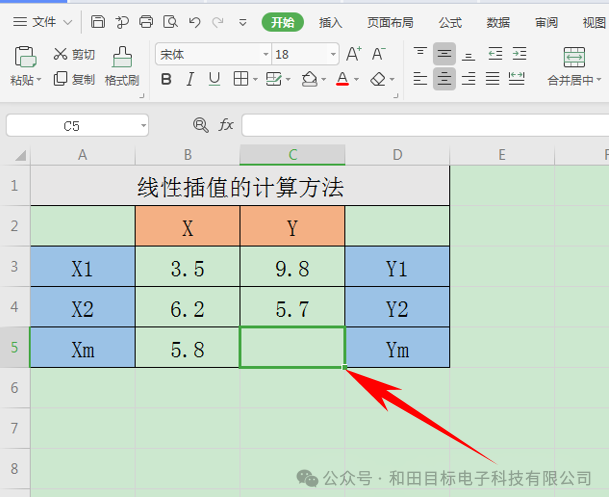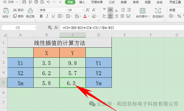 我们知道因变量的公式为Ym=Y1+(Xm-X1)*(Y2-Y1)/(X2-X1),如果手动计算的话确实有些麻烦,在Ym因变量的单元格当中,输入公式“=C3+(B5-B3)*(C4-C3)/(B4-B3)”,这里的单元格可以根据自己的表格进行更改: