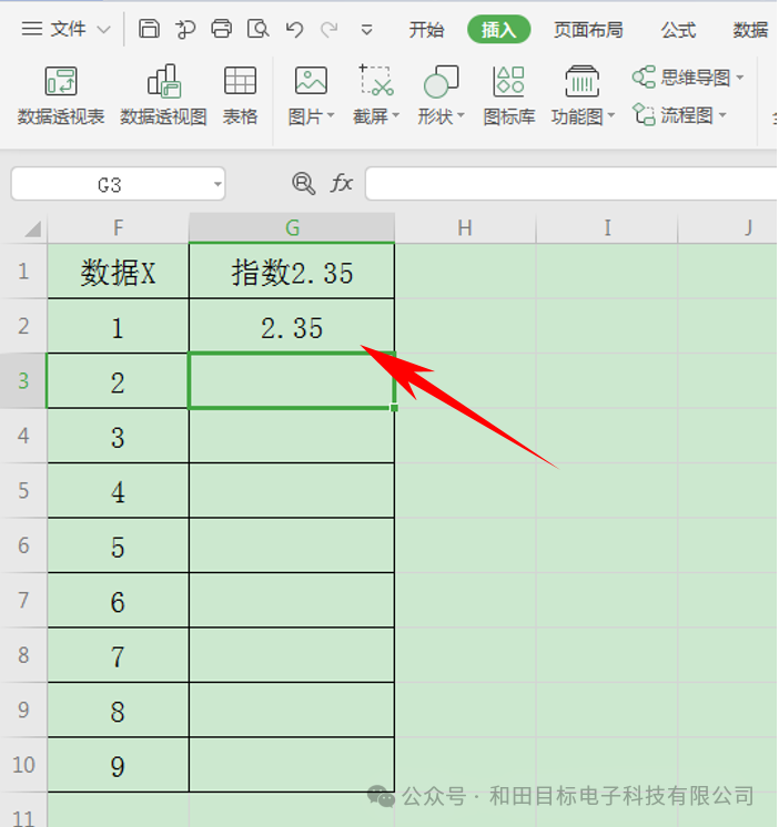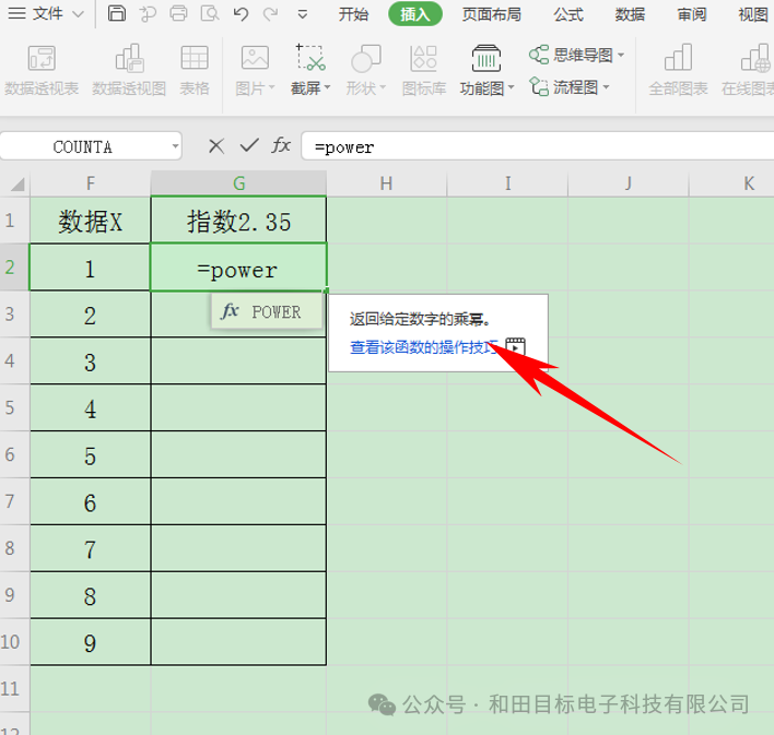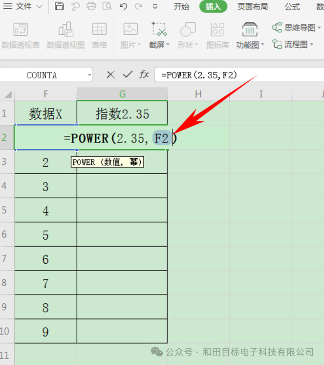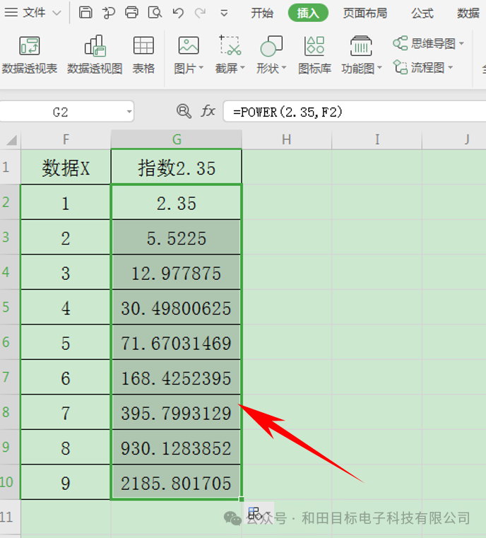 然后输入公式“=POWER(2.35,F2)”,如下图所示,2.35代表我们给定的指数数值: