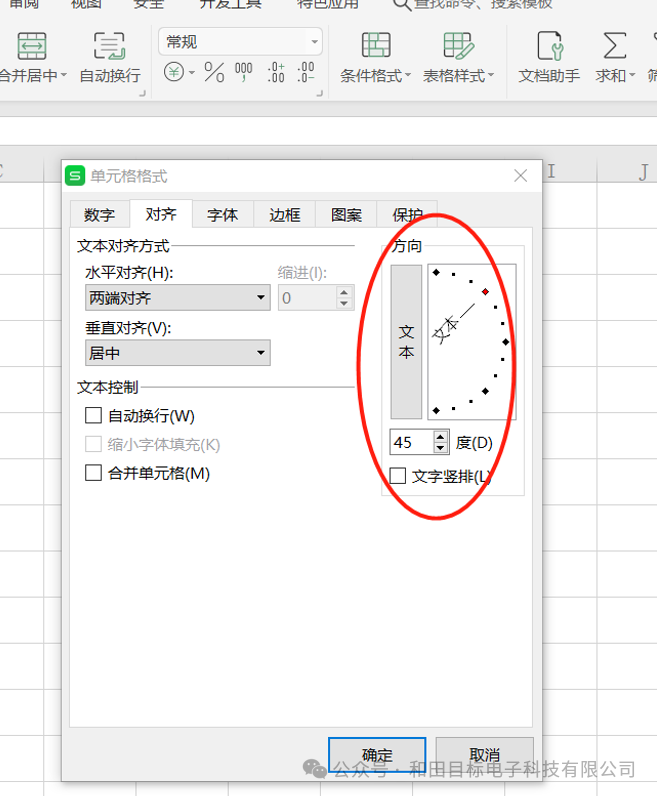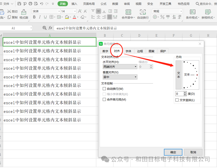 在方向的文本下方,输入想要的倾斜角度如“45”度,或者用鼠标点文本的方向“—”符号,调整角度,如下图所示: