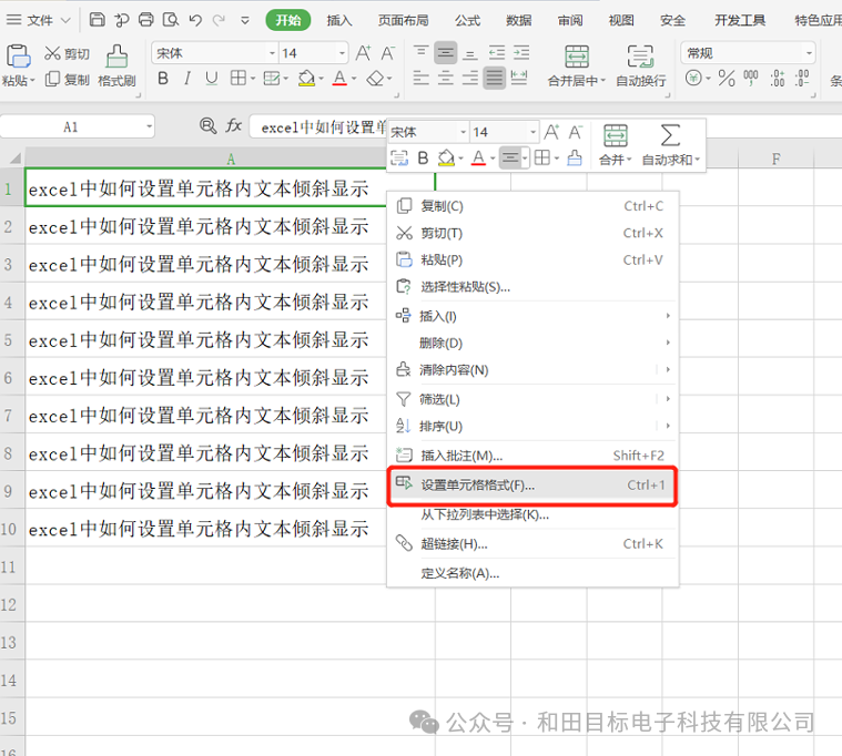 首先选中需要设置文本倾斜的单元格,点击鼠标右键,在弹出来的选项中点“设置单元格格式”,如下图红色标记: