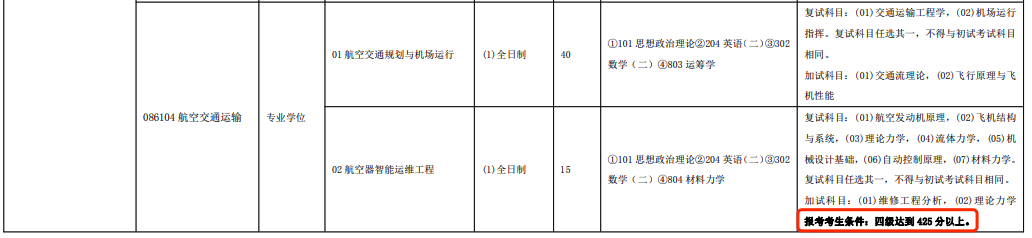 该校24年招生简章中多专业要求四级达到425分及以上,如:计算机科学与技术、交通运输工程、机械工程、航空交通运输等。
